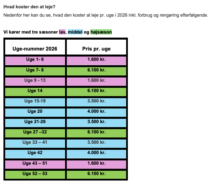 I dropdown menuen i formularen, kan du se, hvilke uger lejligheden er ledig i. Lige ovenfor i tabellen, kan du se, hvad den koster at leje i den pågældende uge. Prisen er inkl. forbrug og afsluttende rengøring.