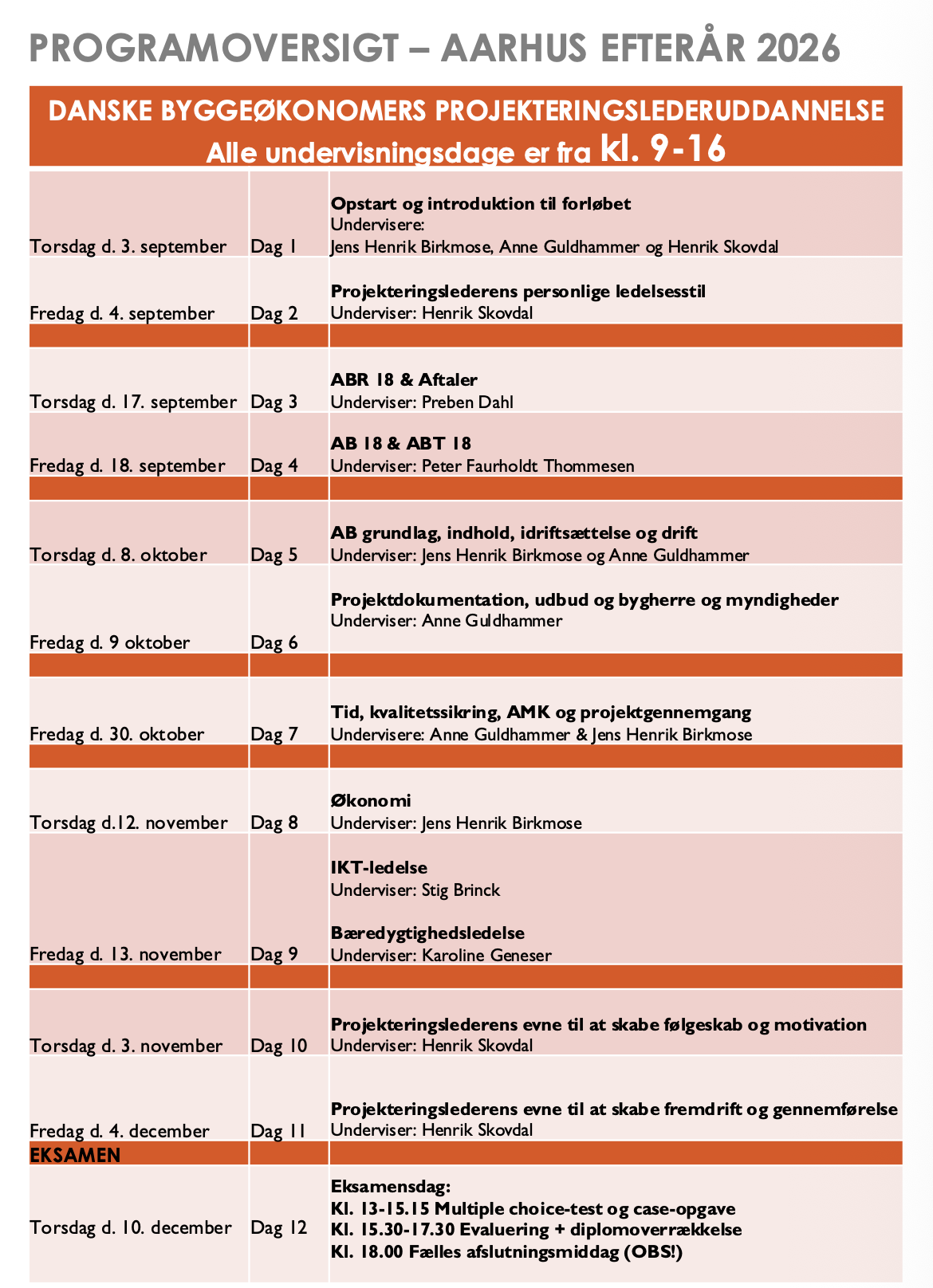 På uddannelsen har vi samlet nogle af branchens spidskompetencer til at undervise på vores 12-dages uddannelse, der kobler teori og praktiske værktøjer sammen. Alle aspekter af projekteringsledelse vil blive behandlet på uddannelsen.